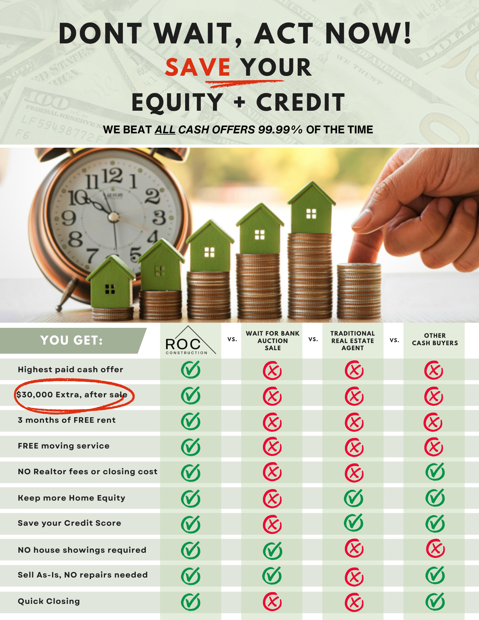 Because we are a direct buyer that does not need to split profits with additional investors, this allows us to share the profit with you as a bonus check after the sale.